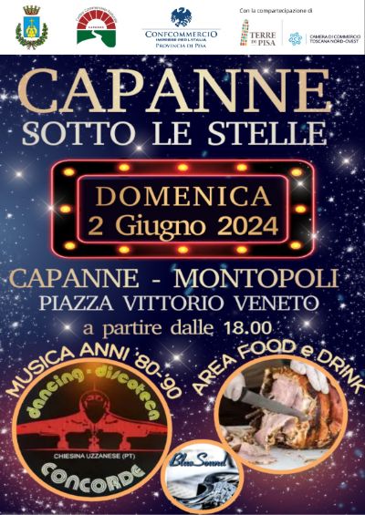 Dopo il successo della prima edizione torna l’appuntamento con Capanne sotto le Stelle, la manifestazione organizzata da Confcommercio Provincia di Pisa e dal Centro Commerciale Naturale di Capanne con il patrocinio del Comune di Montopoli Valdarno e la compartecipazione della Camera di Commercio della Toscana Nord-Ovest – Terre di Pisa. L’evento è sostenuto dalla Banca Popolare di Lajatico e sponsorizzato da Carrozzeria Di Gianni, Nicole, Molart, Chiara Cioni Assicurazioni, Panificio Il Centi, Fogli Idraulica, DPA Impianti e Zolfanelli.