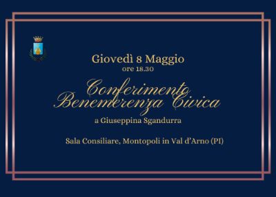 Tutta la cittadinanza è invitata alla Cerimonia di conferimento della Benemerenza Civica alla cittadina montopolese Giuseppina Sgandurra, insignita dal Presidente della Repubblica Sergio Mattarella dell'alta onorificenza di Cavaliere dell'Ordine al Merito della Repubblica Italiana riconoscendone il valore del lavoro scientifico e il contributo significativo nel campo della disabilità in età evolutiva.