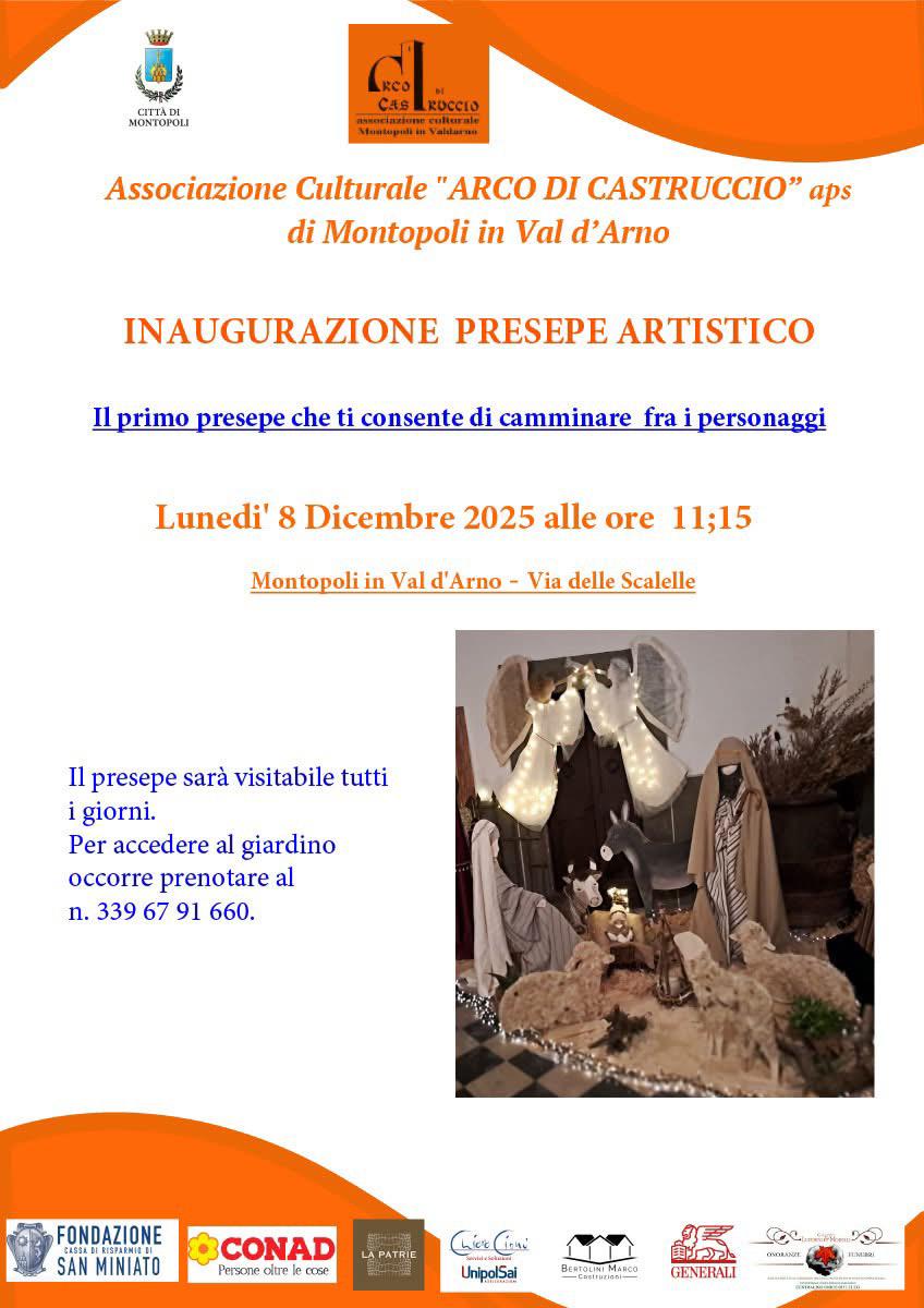 Lunedì 8 dicembre alle 11.15 sarà inaugurato il presepe artistico dell'associazione culturale Arco di Castruccio. Il primo presepe che consente ai visitatori di camminare fra i personaggi.