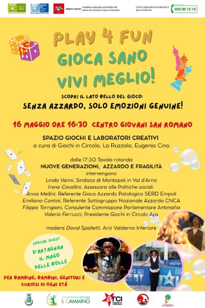 Venerdì 16 maggio a Montopoli “Play 4 Fun – Gioca sano, vivi meglio”, iniziativa organizzata in collaborazione con Arci Valdarno Inferiore e Coop. Soc. Il cammino, nell'ambito degli interventi di contrasto al gioco d'azzardo promossi da Regione Toscana, Ausl Toscana Centro e SDS Empolese Valdarno Valdelsa