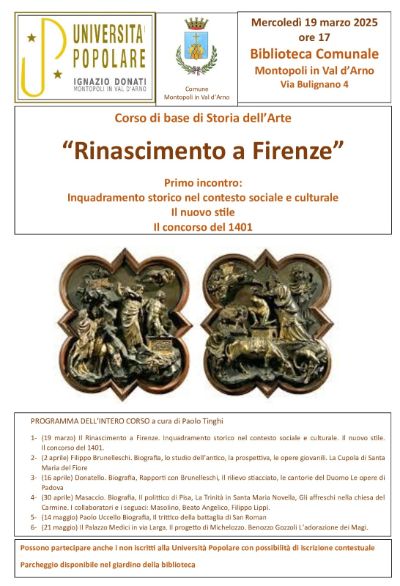Comincia mercoledì 19 marzo alle 17 il corso base di Storia dell'Arte "Rinascimento a Firenze" organizzato dall'Università Popolare Ignazio Donati.