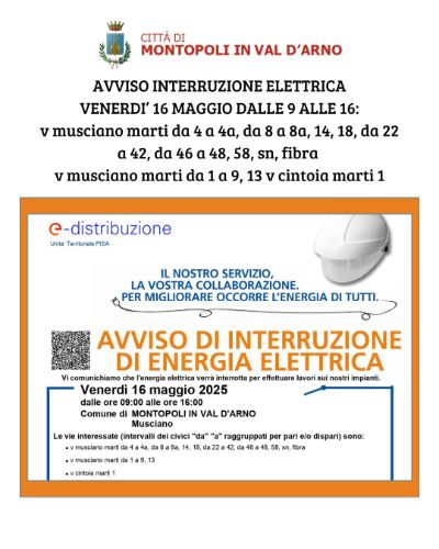E-distribuzione comunica che venerdì 16 maggio dalle 9 alle 16 sarà interrotta l'energia elettrica per effettuare lavori sugli impianti.
