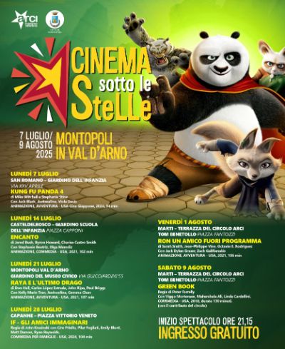 Si comincia lunedì 7 Luglio, al giardino della scuola dell'infanzia di San Romano in via XXV Aprile, con un appuntamento tutto dedicato ai più piccoli e la proiezione di Kung Fu Panda 4; per poi continuare il lunedì successivo, 14 Luglio, a Casteldelbosco, anche qui nel cortile della scuola della frazione, con il film di animazione Disney Encanto. Sempre targato Disney anche l'appuntamento di lunedì 21 Luglio nel Capoluogo, al giardino del Museo Civico in via Guicciardini 55, con il film animato Raya e l'ultimo drago.